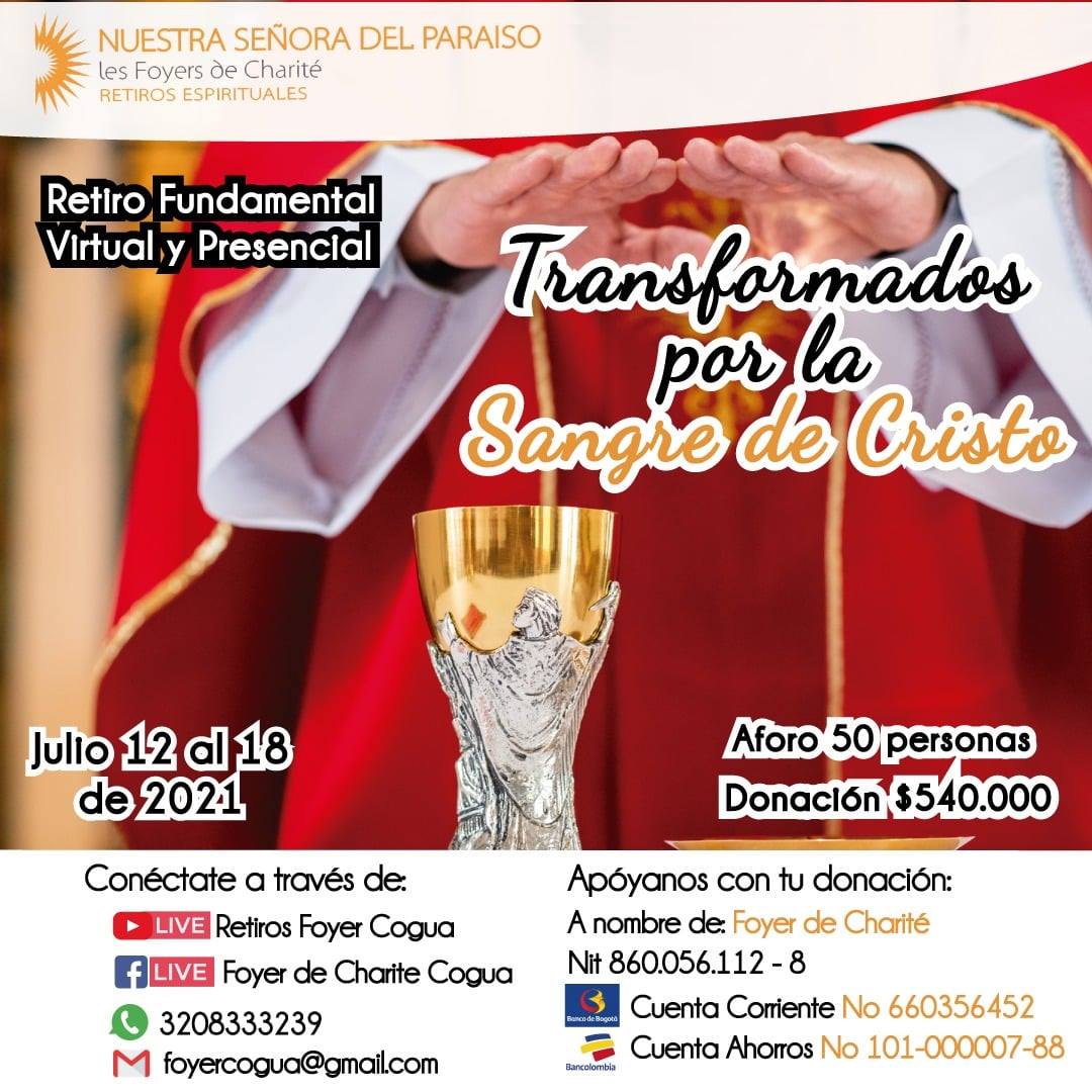 La casa de retiros Foyer de Charité, ubicada en la vereda La Plazuela de Cogua, constantemente realiza encuentros de formación y profundización espiritual que contribuyen con el enriquecimiento de quienes lo hacen, por tratarse de una experiencia muy personal. Dada la coyuntura de la pandemia, el Foyer venía realizando retiros solo de manera virtual. Ahora, bajo un protocolo y medidas especiales, se adecuó la casa para retomar retiros presenciales con un aforo limitado de 50 personas. Para la semana del 12 al 18 de julio, el Foyer realizará el retiro “Transformados por la Sangre de Cristo”, en consecuencia, solo hay 50 cupos presenciales disponibles y la reserva se puede hacer a través del contacto y WhatsApp 320 833 32 39Igualmente, quien desee puede seguir el retiro virtual y contribuir con una ofrenda para esta casa de retiros, a través de la cuenta que aparece en la imagen aquí adjunta.El retiro se podrá seguir a través de Facebook:https://www.facebook.com/foyerdecharite.cogua/O de YouTube: https://www.youtube.com/user/FoyerDeChariteCogua