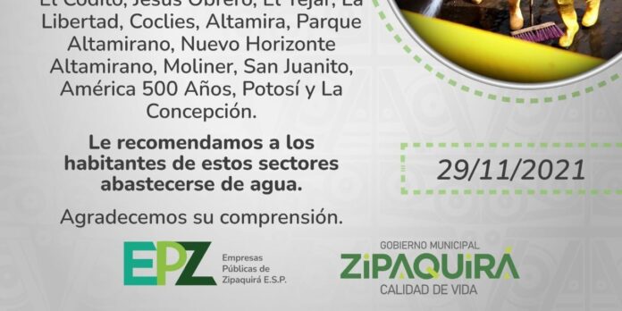 Empresas Públicas de Zipaquirá EPZ, efectuará mañana 30 de noviembre a partir de las 7:00 a.m. y hasta las 3:00 p.m., aproximadamente, un corte de servicio de acueducto para adelantar el lavado de la Planta Galán.