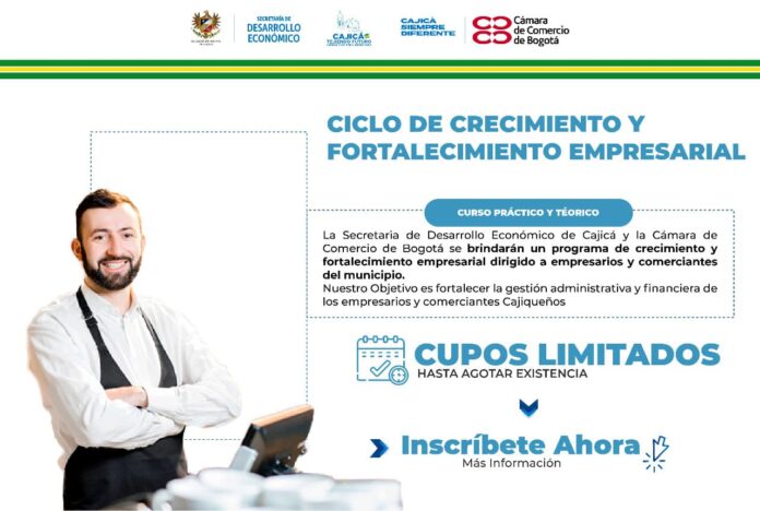 La alcaldía de Cajicá, la secretaría de Desarrollo Económico y la Cámara de Comercio de Bogotá, realizarán el programa de crecimiento y fortalecimiento empresarial, teórico práctico, dirigido a comerciantes y empresarios del Municipio.