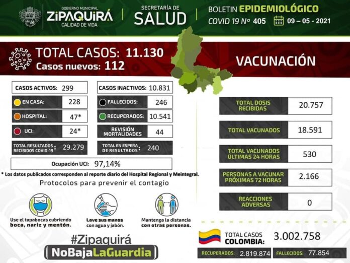 Zipaquirá registra 345 casos positivos de Covid de los cuales, en casa se están recuperando 273, hay 44 hospitalizadas y 27 en la Unidad de Cuidados Intensivos (UCI). Se han recuperado 10.624 y la cifra de fallecidos llegó a 249 personas.