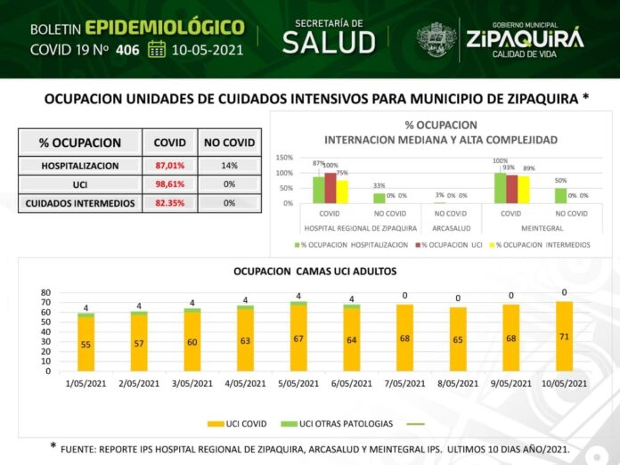 En cuanto a ocupación UCI, ayer quedaba una cama disponible y aunque lamentablemente fallecieron el abogado José Cortés y el enfermero Víctor Zambrano, dejando dos camas más, hoy 3 zipaquireños ocuparon estas unidades, de tal suerte que el Hospital Regional está al 100% de su capacidad.