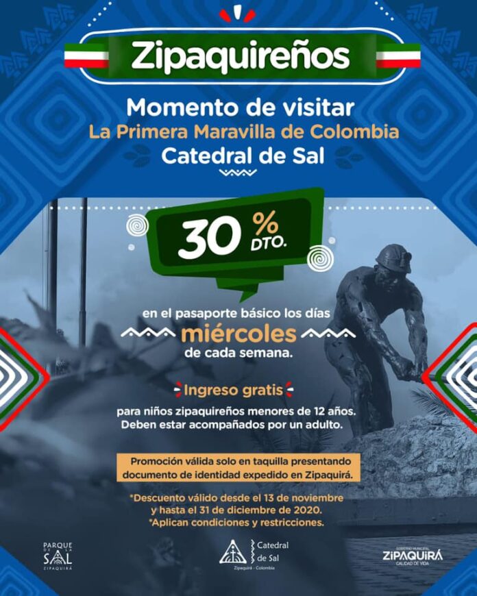 Con el fin de facilitar que los zipaquireños puedan ingresar con un precio especial a visitar la Primera Maravilla Turística de Colombia, los miércoles hasta el 30 de diciembre, los niños menores de 12 años ingresarán gratuitamente y los adultos pagarán solo $10.500. “Es el deseo del señor Alcalde que ojalá todos los zipaquireños puedan conocer o visitar su Catedral y por eso diseñamos esta alternativa para los días miércoles. Adicionalmente para los familiares que vengan de fuera se les hará un descuento del 20% en la boleta. Hoy el tiquete para cualquier turista nacional cuesta $60.500 y tenemos una promoción especial en $38.500. Para el caso de los zipaquireños el único requisito es presentar la cédula que lo acredite como tal” dijo a Gente Activa el gerente de Catedral de Sal, Orlando Sotelo.
