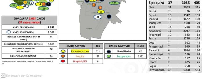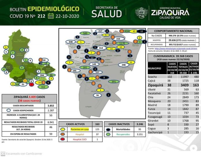 De acuerdo con los boletines de los últimos días, expedidos por el Instituto Nacional de Salud, Zipaquirá aumentó 97 casos (viernes 20 – sábado 18- domingo 37 y ayer lunes festivo 22), totalizando 3.107 personas positivas. De esta cifra, 376 casos están activos, 343 personas por presentar síntomas leves permanecen en sus residencias; 33 están hospitalizadas, 2.644 se han recuperado y lamentablemente 87 han fallecido.