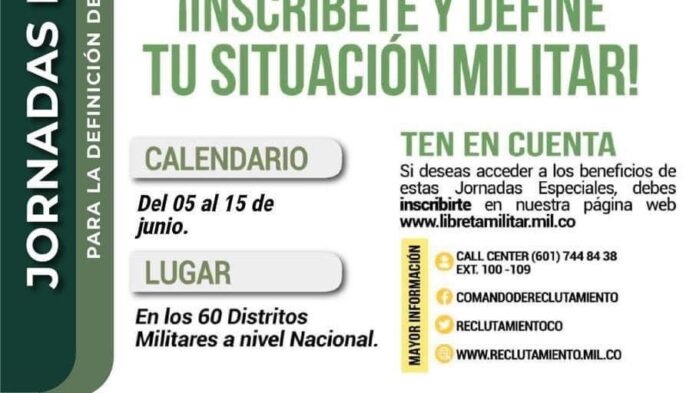 Dadas las instrucciones del comando del Ejército Nacional, en los 60 distritos militares de reclutamiento en Colombia, se adelantará una jornada especial para facilitar que quienes aún no han definido su situación militar lo puedan hacer con descuentos y en corto tiempo.