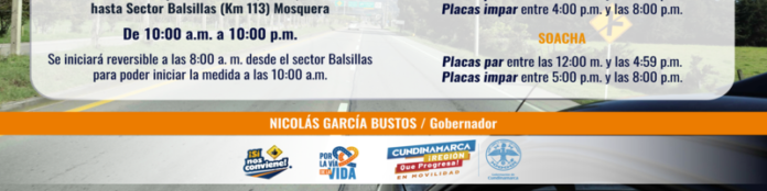 Para el Plan Retorno habrá reversible desde las 10:00 a.m. hasta las 10:00 p.m. por la vía de La Mesa, desde Apulo hasta el sector de Balsillas, en Mosquera. Para garantizar su efectividad se iniciará reversible a las 8:00 a.m. desde el sector de Balsillas para que la medida inicie a las 10:00 a.m.