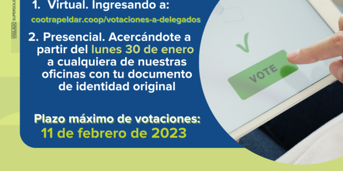 Desde el 30 de enero y hasta el 11 de febrero, a las 4:00 p.m., Cootrapeldar tendrá habilitada las votaciones para la elección de los delegados a la Asamblea 2023.
