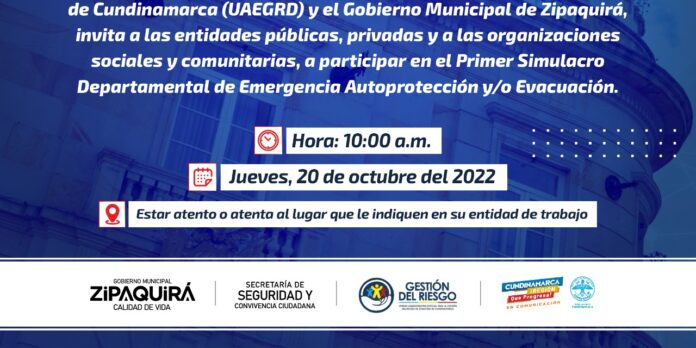La gobernación de Cundinamarca, a través de la Unidad Administrativa Especial para la Gestión del Riesgo de Desastres de Cundinamarca y el gobierno municipal de Zipaquirá, realizan el simulacro en compañía de las diferentes entidades públicas, privadas, organizaciones sociales y comunitarias.