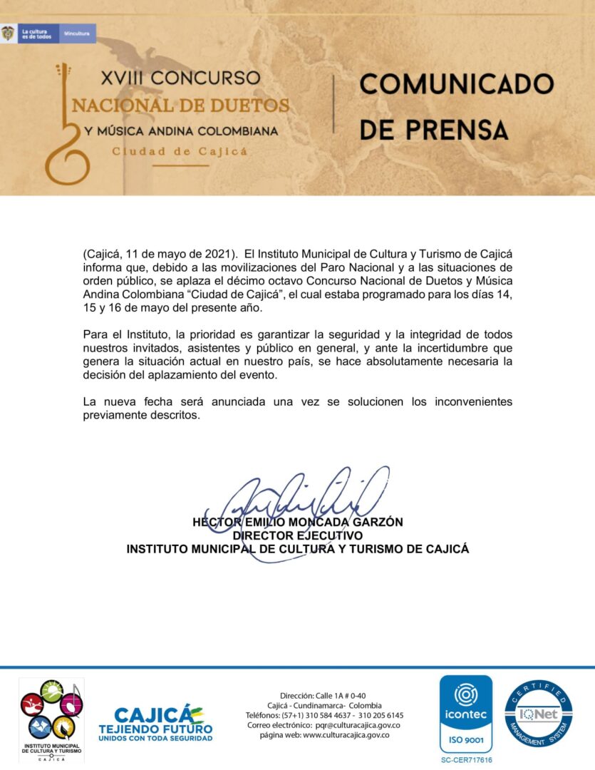 El instituto Municipal de Cultura y Turismo de Cajicá, en cabeza de su Director Héctor Emilio Moncada informa a la ciudadanía que se aplaza el XVIII Concurso Nacional de Duetos y Música Andina Colombiana denominado “Ciudad de Cajicá”
