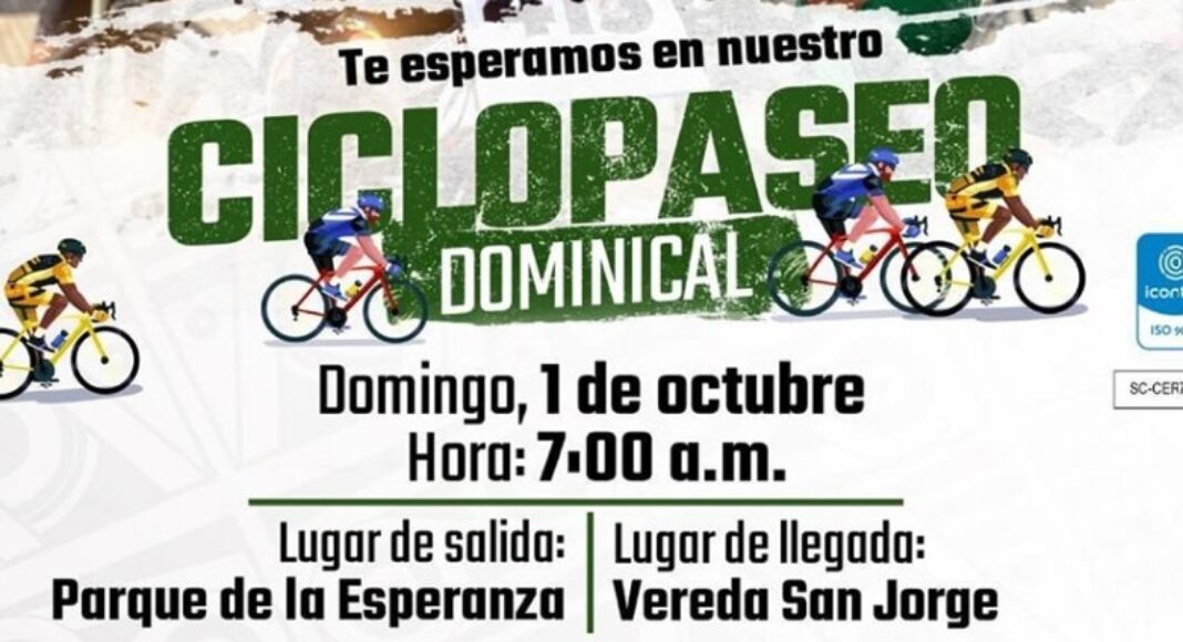 El IMCRDZ realizará este 1 de octubre un ciclopaseo a la vereda San Jorge. El punto de partida será el Parque de La Esperanza a las 7:00 a.m.