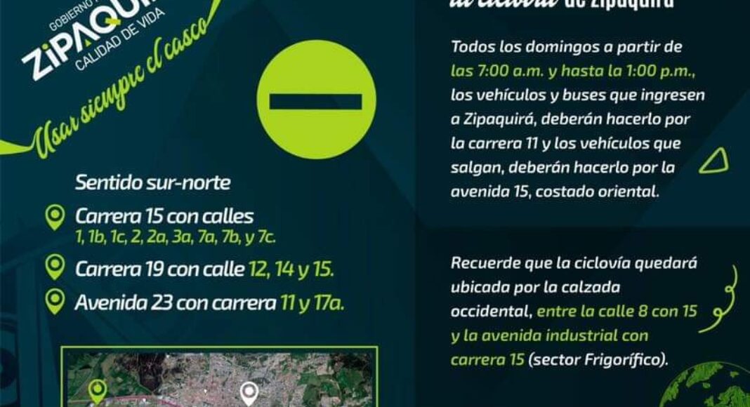 Ahora los domingos tienen una importante variación en el flujo vehicular de Zipaquirá. Con cambios para mejorar la movilidad vial, que incluyen dejar la Avenida 15 en sentido de salida desde la calle Octava hasta la Av. Industrial y la carrera 11 de ingreso por el retén, así como el uso del carril occidental para que los usuarios se desplacen de forma más segura, integrando los recorridos con el parque de La Esperanza, la ciclovía regresó a la Ciudad de la Sal después de seis meses de cierre.