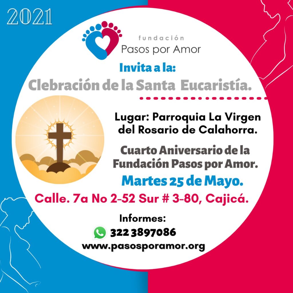 Pasos por Amor celebrará su cuarto aniversario, este 25 de mayo, « Damos gracias a Dios por que juntos hemos dado pasos por amor en la defensa de la vida, desde la concepción hasta la muerte natural. Acompáñanos este martes 25 de mayo, a las 5:30 p.m. con el Rosario por la Vida y a las 6:00 p.m. con la Santa Eucaristía en acción de gracias, en la parroquia Virgen del Rosario de Calahorra, en Cajicá», puntualizó Imelda.