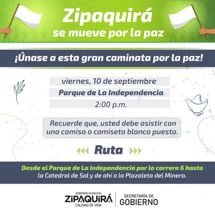 “Quienes quieran acompañarnos y participar de esta actividad, nos encontraremos en el Parque de La Independencia, llevar camiseta blanca, jean, tenis, cómodos, con toda la actitud. Con la caminata daremos pasos de paz y reconciliación, cerraremos con un acto simbólico y cultural.” Así lo expresó Alejandro Ramírez Roa, secretario de Gobierno.