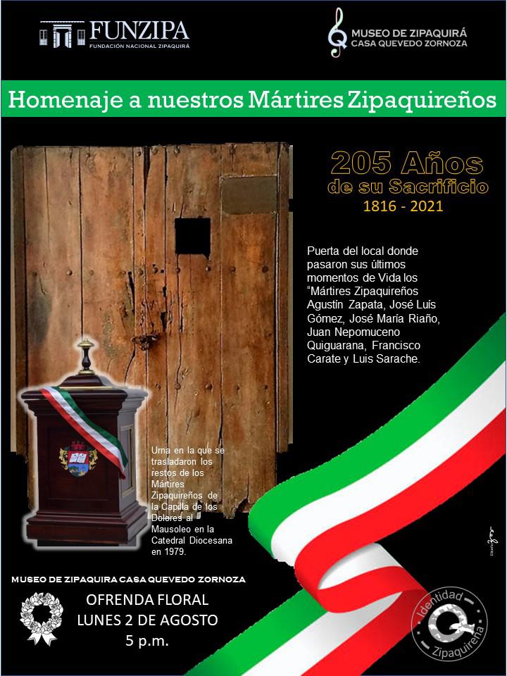 Por su parte, el Museo de Zipaquirá Casa Quevedo Zornoza, hará el tradicional homenaje ante la puerta del local donde pasaron sus últimos momentos los mártires, y a las 5:00 p.m. efectuará la ofrenda floral.