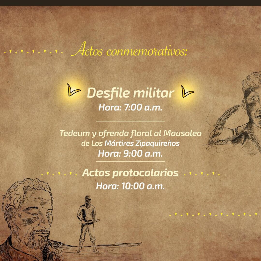 Desde las 7:00 a.m., se realizará el tradicional desfile militar cuyo recorrido terminará en la Plaza de los Comuneros. A continuación, sobre las a las 9:00 a.m., en la Catedral Diocesana se llevará a cabo, el Tedeum y la ofrenda floral, al Mausoleo de los Mártires Zipaquireños.