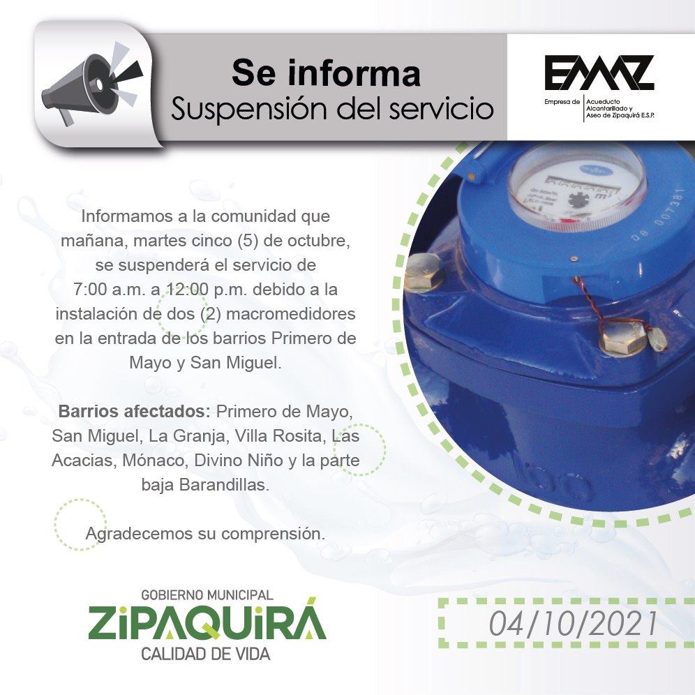 Para poder instalar dos macromedidores a la entrada de los barrios 1ro de Mayo y San Miguel, la Empresa de Acueducto, Alcantarillado y Aseo de Zipaquirá, suspenderá el servicio de acueducto a partir de las 7:00 a.m.