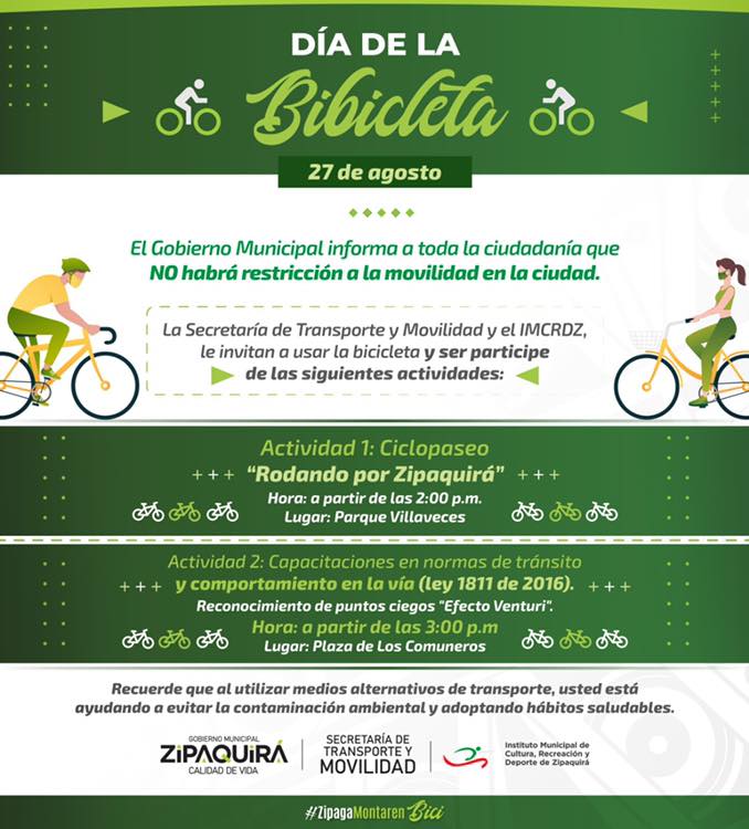 “Para el último viernes del mes de agosto, está establecido por decreto municipal el “Día sin carro”; sin embargo, para este año tomamos la decisión de no aplicar ninguna restricción de vehículos, puesto que se aumentaría la afluencia y aglomeración de usuarios en el transporte público, y en este momento lo que queremos es mantener la disminución de los indicadores epidemiológicos y de contagio por el Covid. Por tanto, quien necesite desplazarse en vehículo por cualquier vía del municipio lo podrá hacer. Lo que sí se mantiene es el “Día de la Bicicleta” y por eso invito a toda la ciudadanía que en lo posible haga uso de su bicicleta para desplazarse a los diferentes lugares. También los invito a que nos unamos al gran ciclopaseo que tendremos desde las 2:00 p.m. como punto de salida en el parque Villaveces. Pero quede claro que “Día sin carro” no habrá este viernes” dijo a Gente Activa, el alcalde Wilson García.