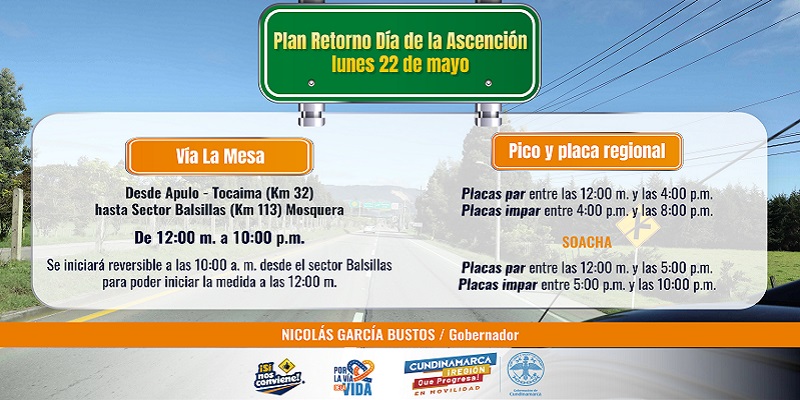 Para el Plan Retorno del lunes 22, habrá reversible desde las 12:00 del mediodía hasta las 10:00 de la noche por la vía de La Mesa, desde Apulo hasta el sector de Balsillas, en Mosquera. Para garantizar su efectividad, se iniciará el reversible a las 10:00 de la mañana, desde el sector de Balsillas.