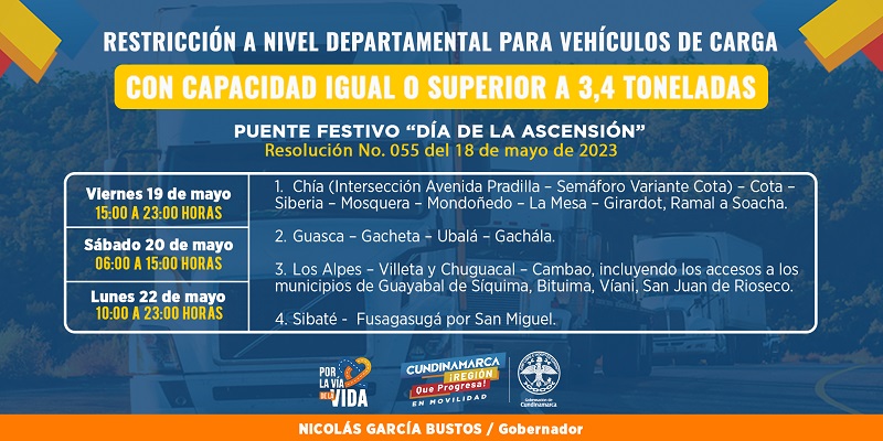 Para el caso de vehículos de carga, con capacidad superior o igual a 3.4 toneladas, se expidió un Boletín Estratégico de Seguridad y Movilidad, por parte del Ministerio de Transporte; adicionalmente, la Secretaría expidió la Resolución No 055, del 18 de mayo de 2023, donde se señalan las siguientes siguientes restricciones: