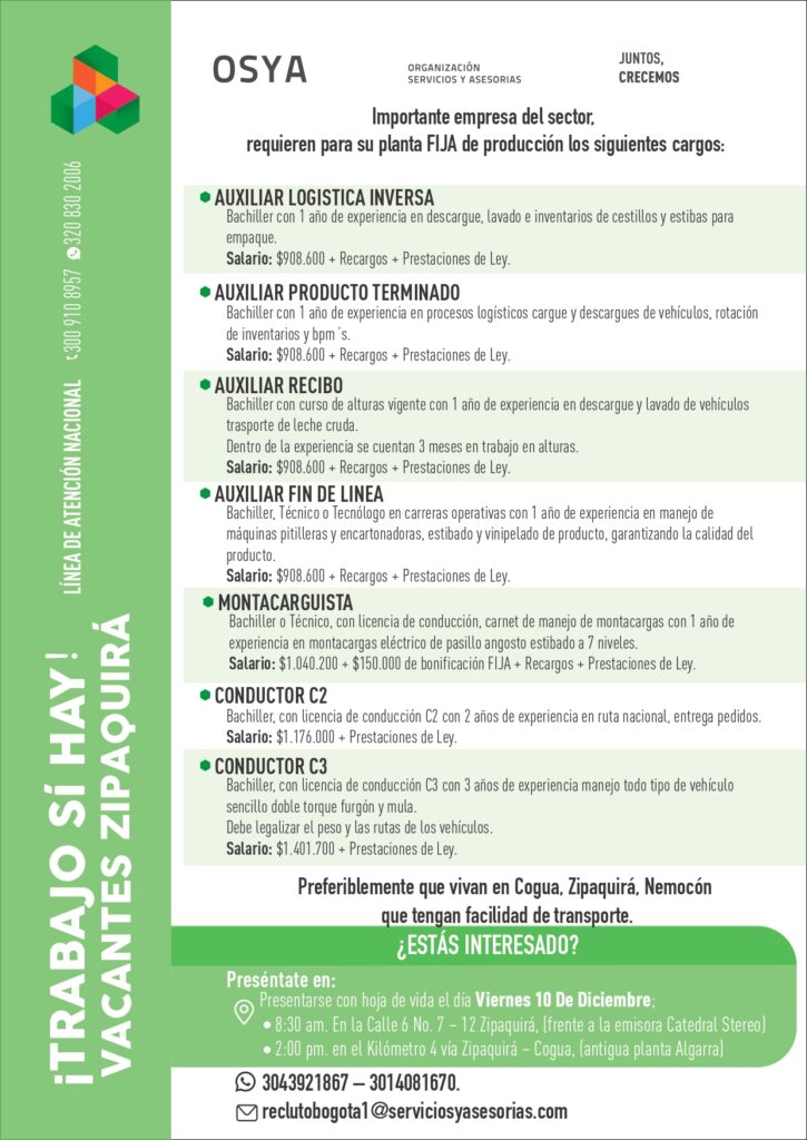 Mañana 10 de diciembre, se realizará una jornada de empleo para vinculación de personal que resida en Zipaquirá, Cogua o Nemocón, en lo posible. Según Claudia Rivera, directora de Gestión Humana de OSYA, se necesita personal en las siguientes áreas: