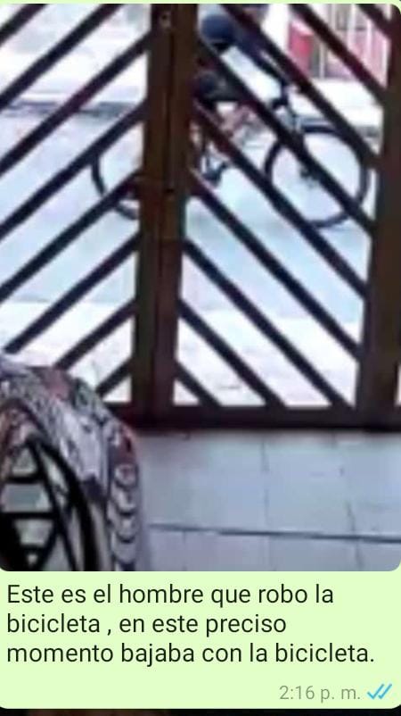 Angela Nieto, una de la afectadas por este hurto, dijo a Gente Activa, “el robo de la bicicleta fue esta mañana en el barrio Santa Clara, frente a la iglesia de San Rafael a las 7:24 a.m. Ya se puso el denuncio. La descripción los dos hombres: uno joven 25 a 30 años, estatura alta, delgado, cabello castaño oscuro, tez blanca, con barba definida en la quijada y de rasgos finos y el otro, de tez morena, estatura baja, cabello negro, constitución gruesa, rasgos gruesos y edad entre 30 y 40 años. La bicicleta es de ruta, marca Rossetti Diablesse color azul con rojo.