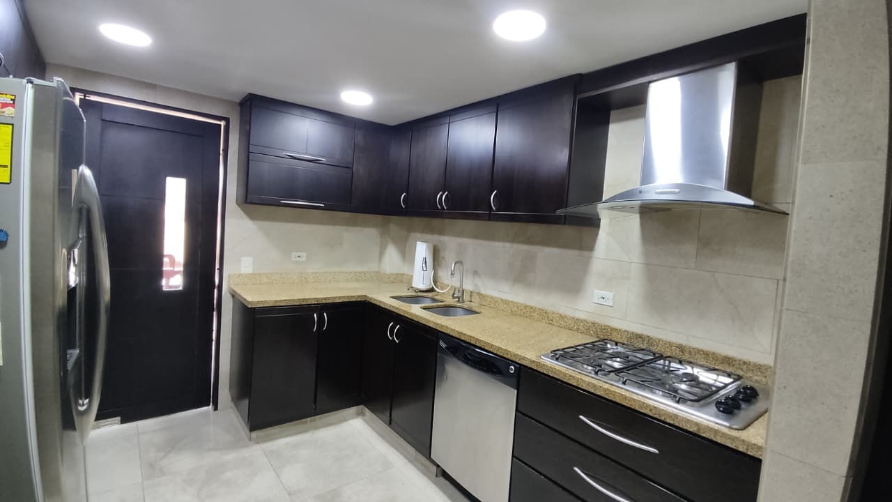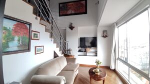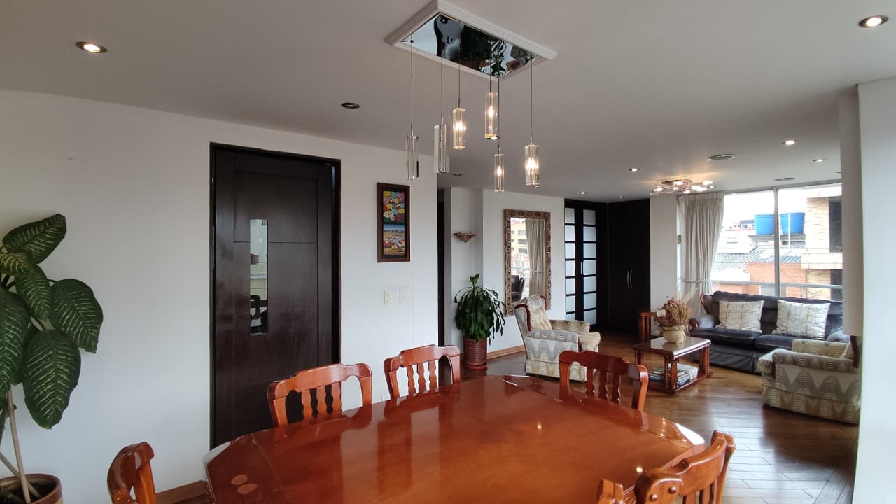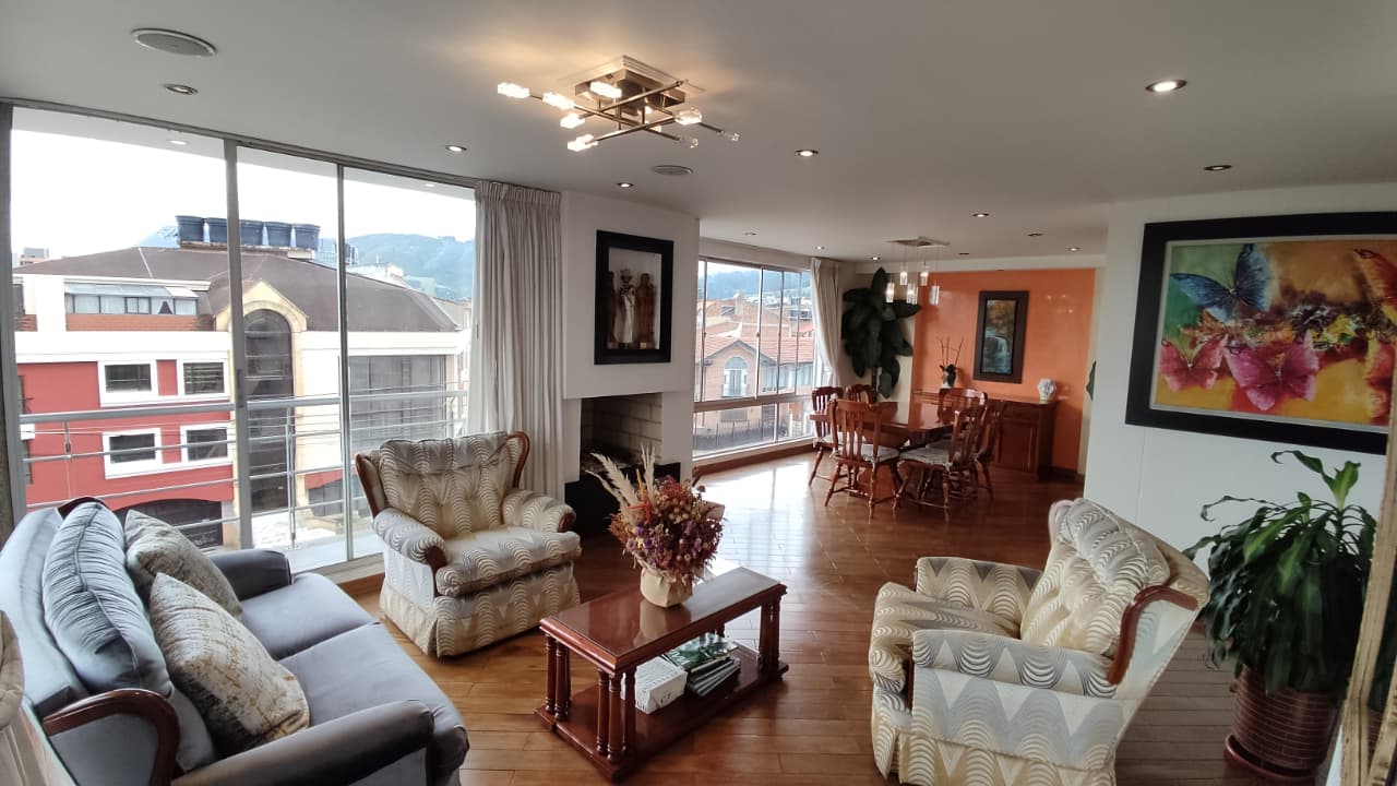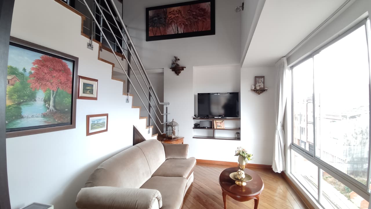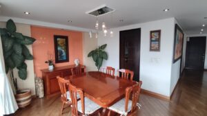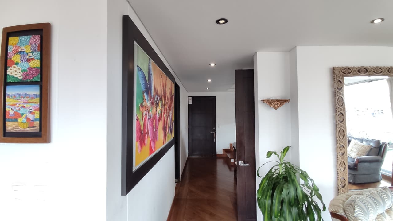 Consta de una amplia sala con chimenea y sonido empotrado, comedor, hermosa cocina integral, área de lavandería, start de TV, estudio y baño social. Habitación principal grande con closet, baño y terraza. Dos habitaciones adicionales. Doble balcón. Los pisos son en madera incienso y las puertas y closets en flor morado. Tiene cámaras privadas, parqueadero independiente, depósito y guardilla.