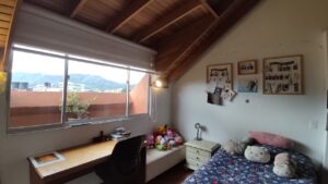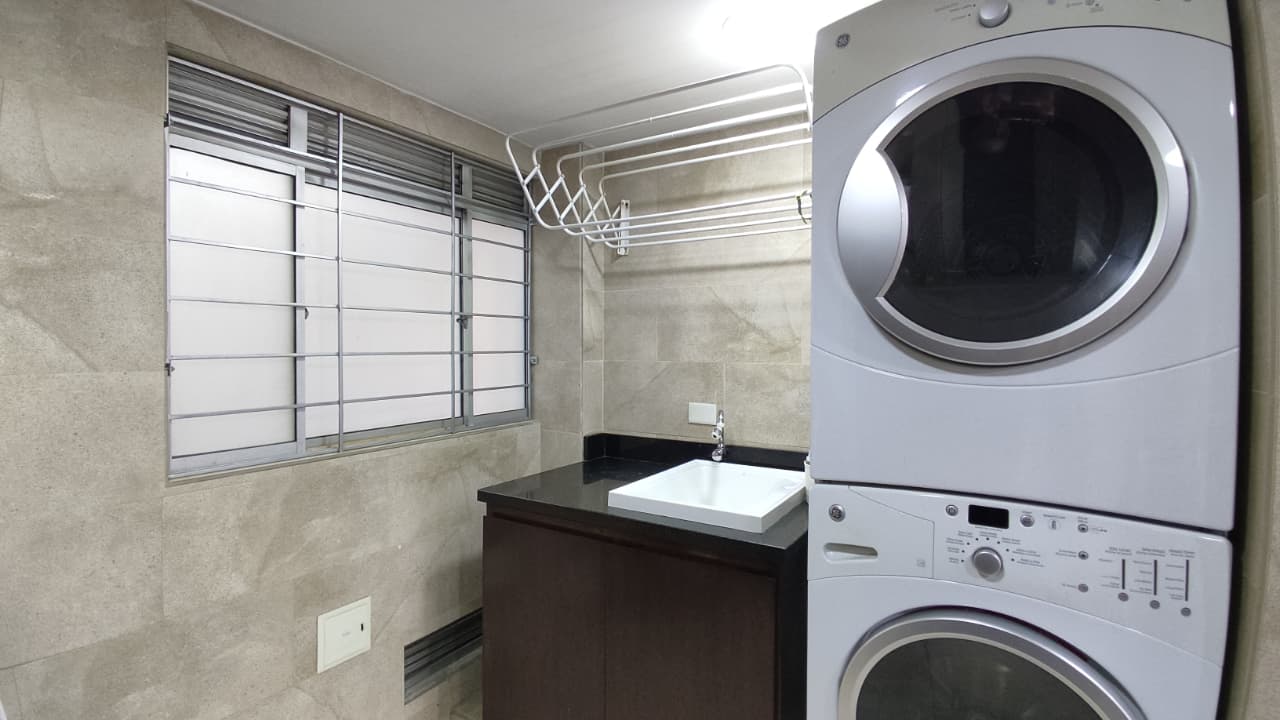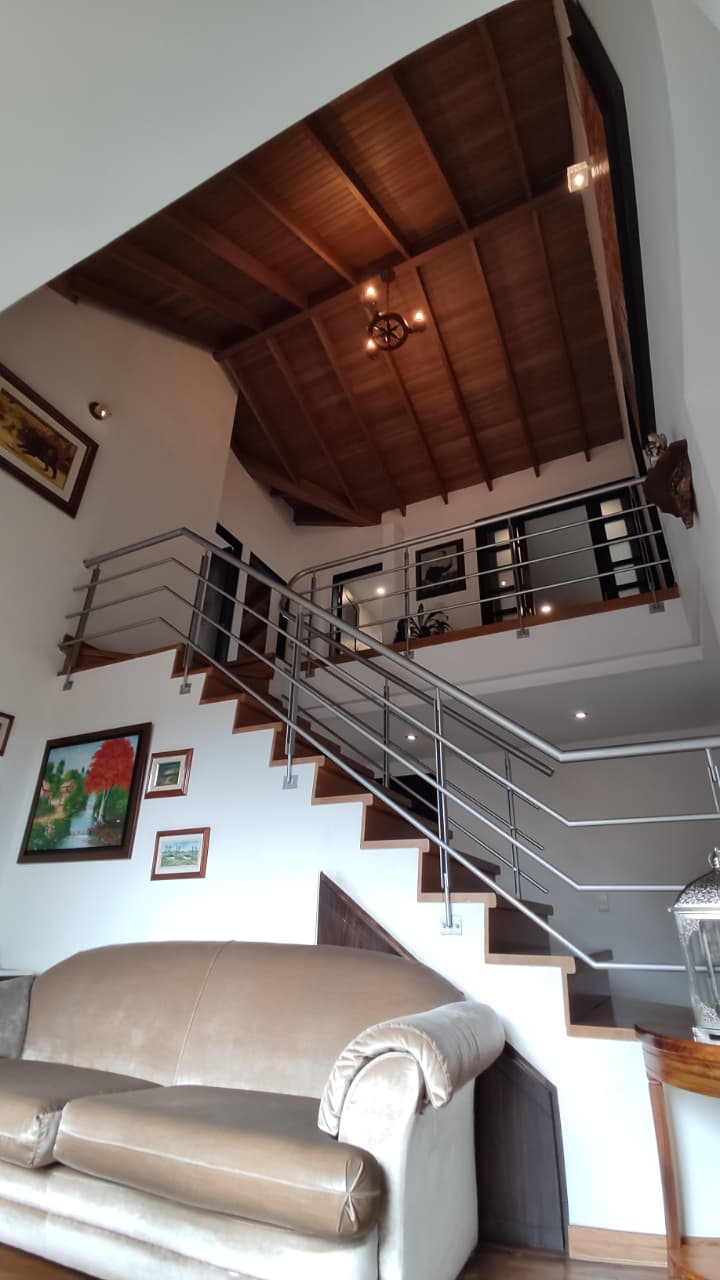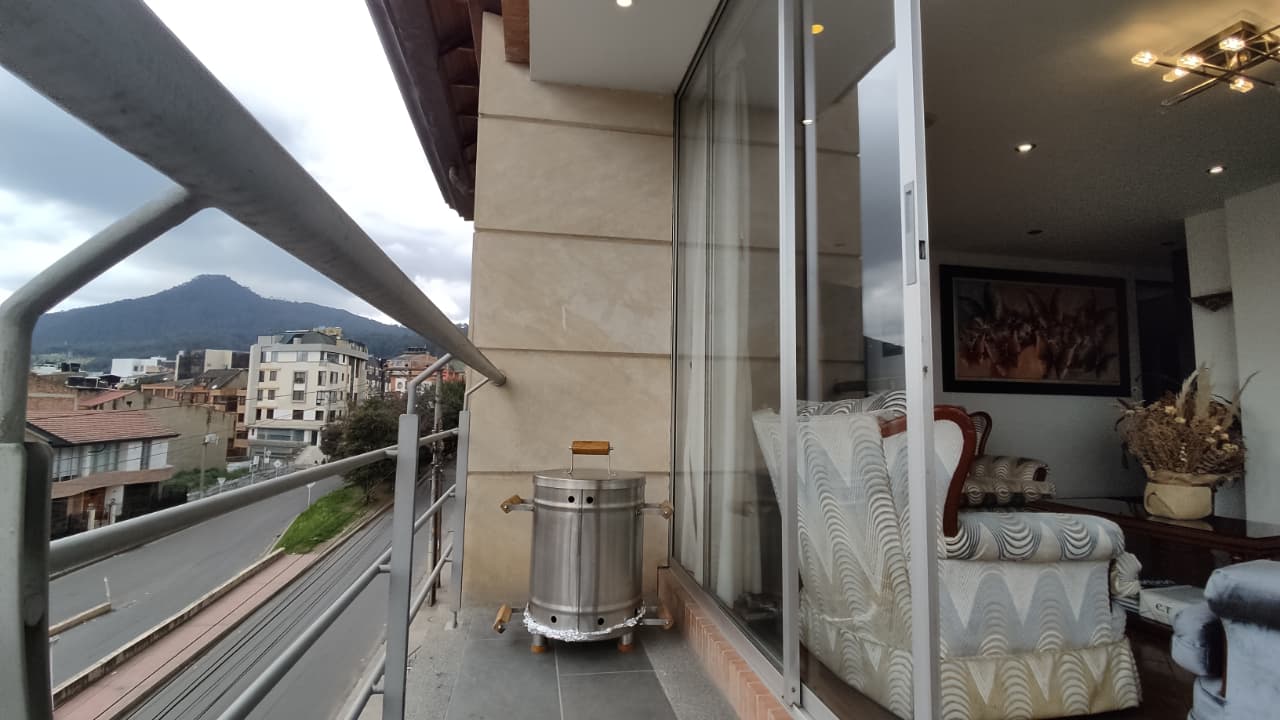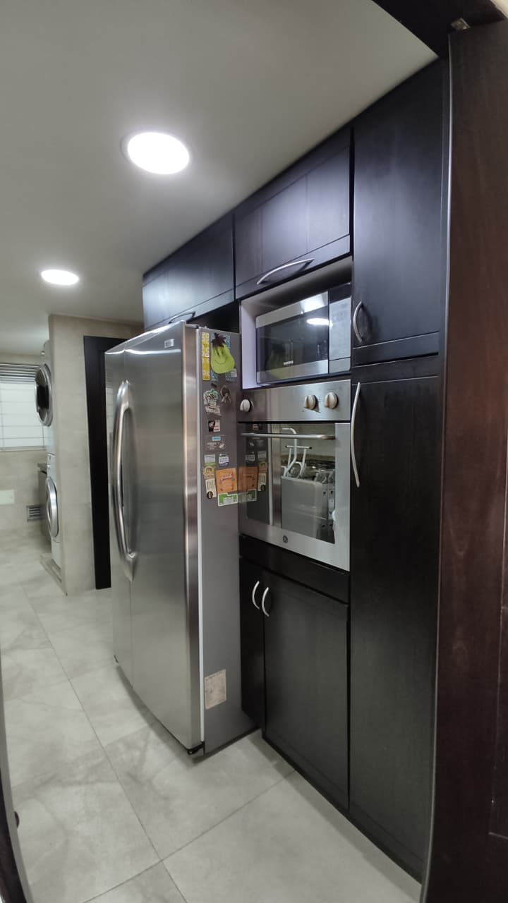 Consta de una amplia sala con chimenea y sonido empotrado, comedor, hermosa cocina integral, área de lavandería, start de TV, estudio y baño social. Habitación principal grande con closet, baño y terraza. Dos habitaciones adicionales. Doble balcón. Los pisos son en madera incienso y las puertas y closets en flor morado. Tiene cámaras privadas, parqueadero independiente, depósito y guardilla.