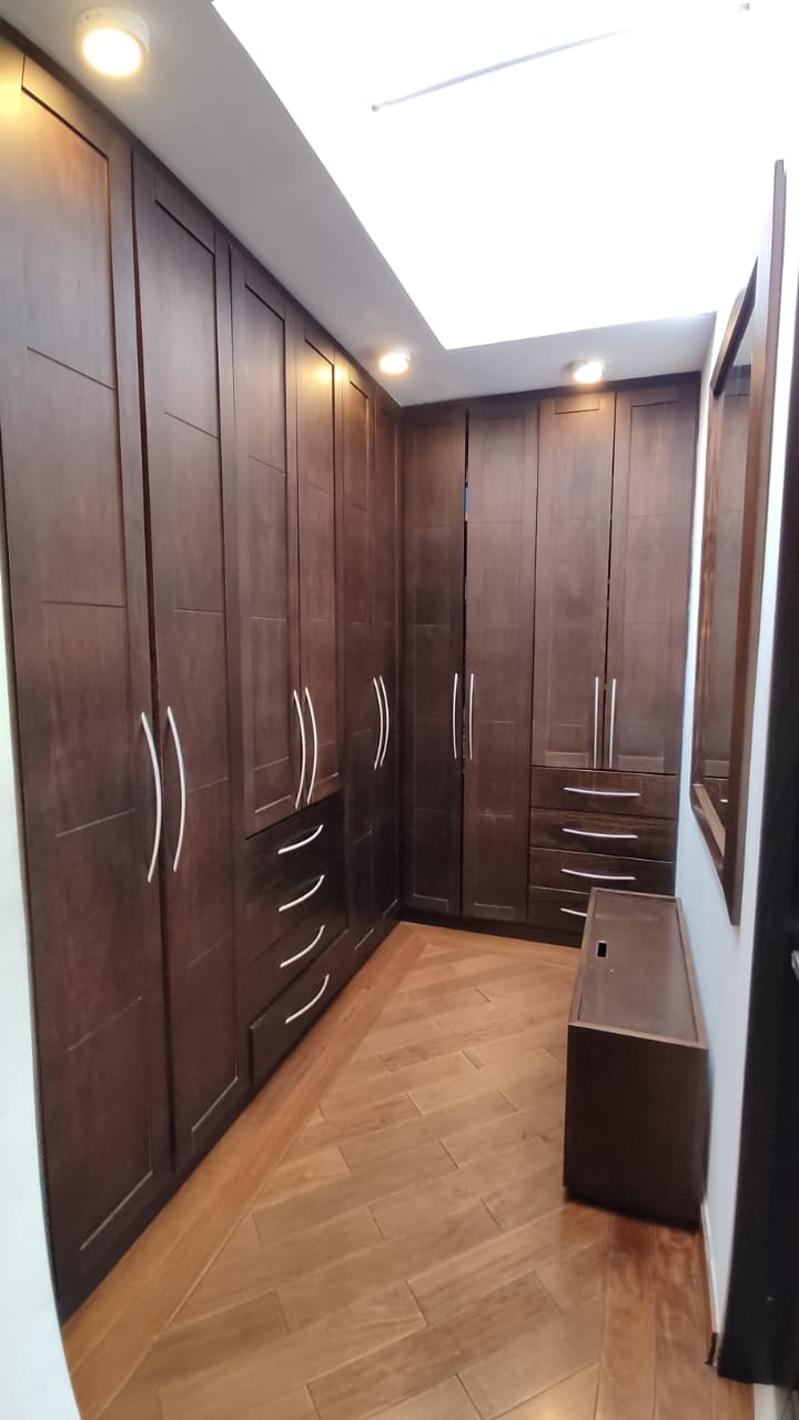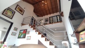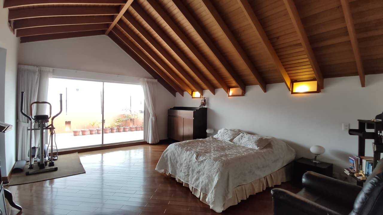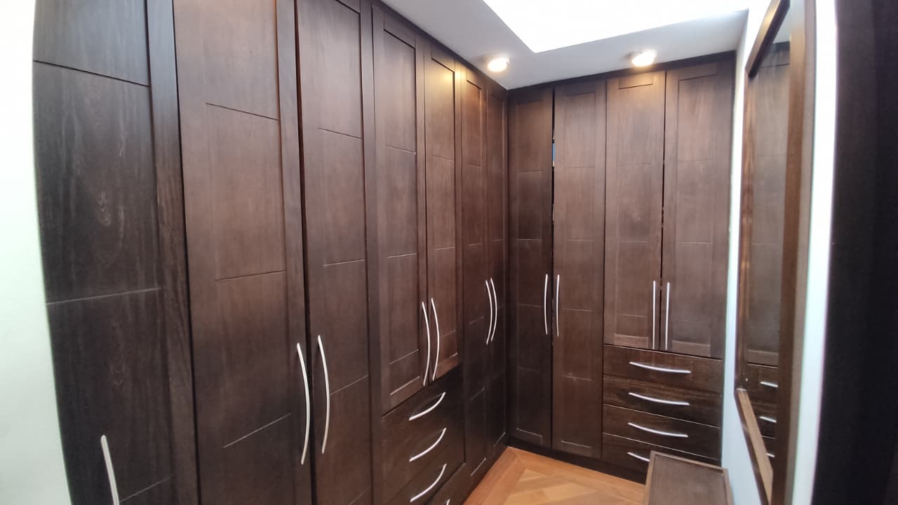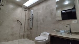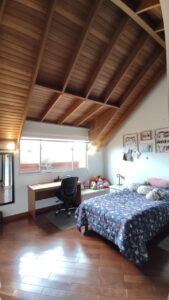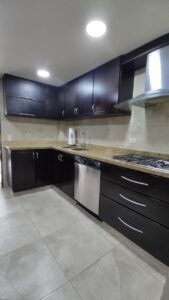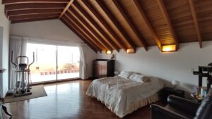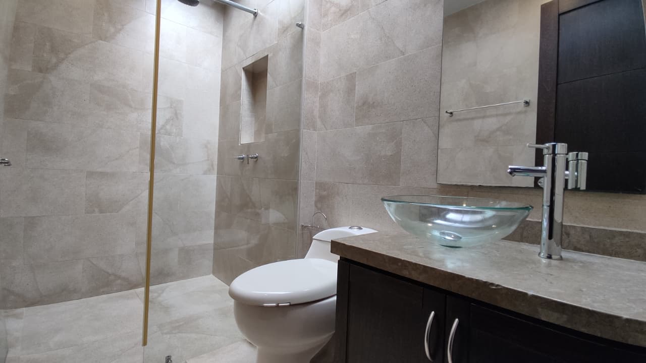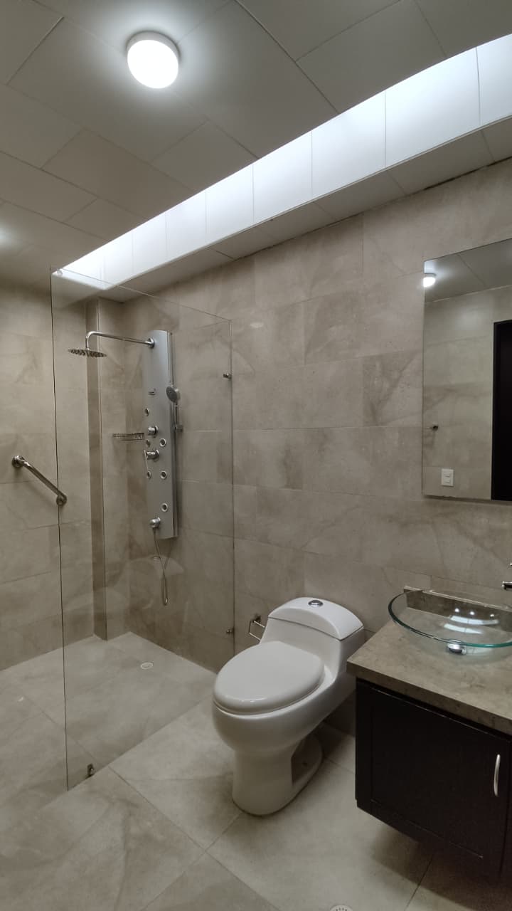 Consta de una amplia sala con chimenea y sonido empotrado, comedor, hermosa cocina integral, área de lavandería, start de TV, estudio y baño social. Habitación principal grande con closet, baño y terraza. Dos habitaciones adicionales. Doble balcón. Los pisos son en madera incienso y las puertas y closets en flor morado. Tiene cámaras privadas, parqueadero independiente, depósito y guardilla.