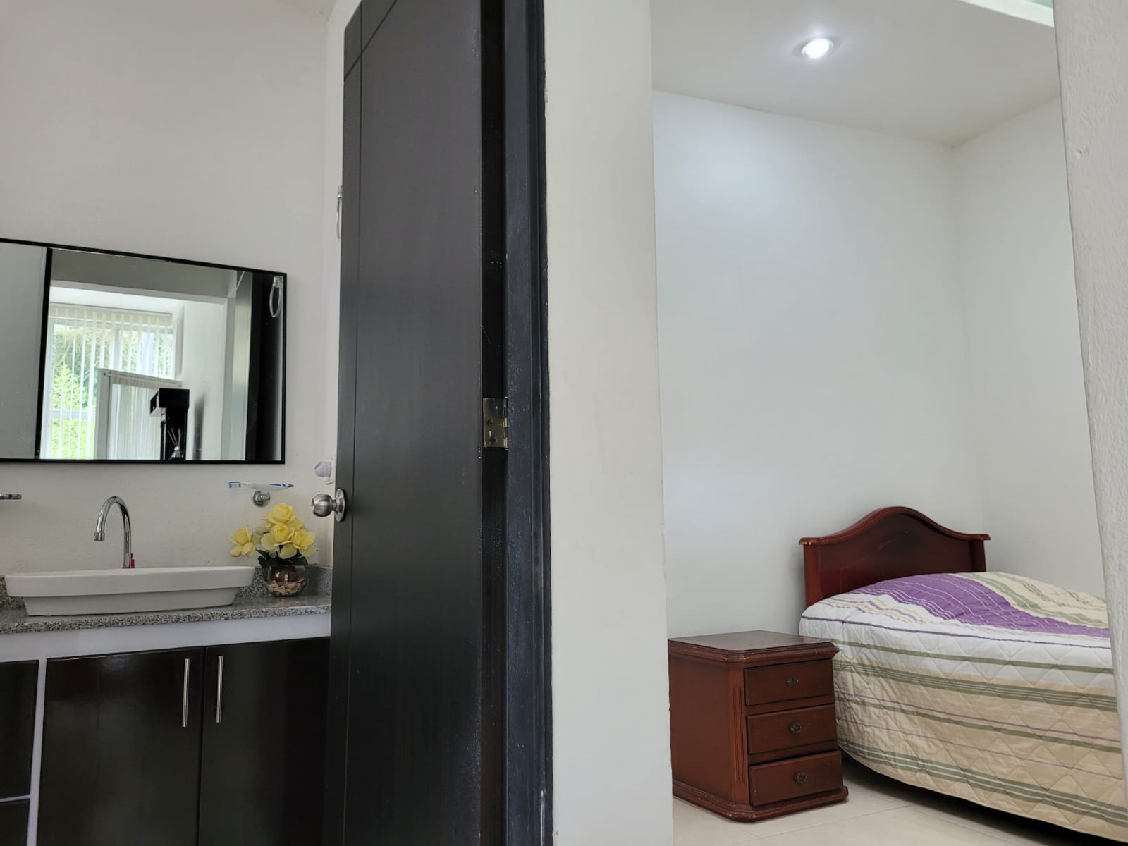 En total, la casa tiene 5 habitaciones para 3 camas dobles y 4 camas sencillas. Seis baños (4 privados y 2 sociales). Se pueden hospedar de 10 a 12 personas.