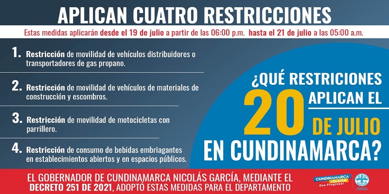 De manera adicional, se determinó la ley seca que consiste en la prohibición de consumo de alcohol en espacios públicos y abiertos, así como en establecimientos comerciales; Invitamos a los alcaldes municipales a activar los consejos de seguridad, en caso de presentarse alguna situación o hecho que afecte el orden público de su jurisdicción. Con estas medidas buscamos preservar la tranquilidad, convivencia y orden público durante las jornadas de protestas y marchas que se puedan registrar el 20 de julio”, expresó el secretario de Gobierno de Cundinamarca, Leonardo Rojas.