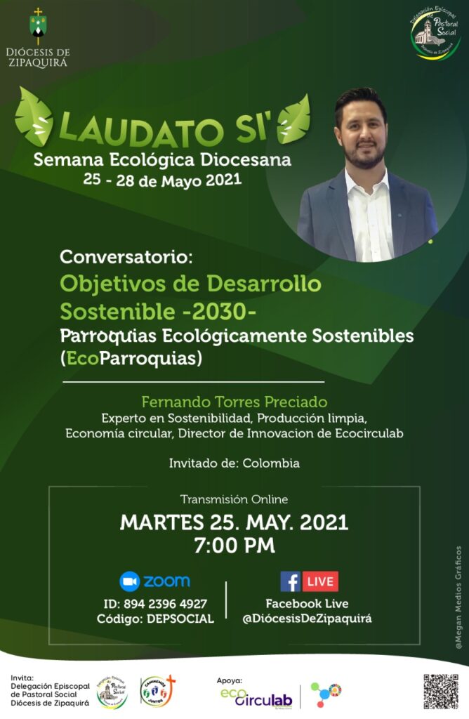 Martes 25 de mayo – Tema: «Familias y parroquias ecológicamente sostenibles» a cargo de Fernando Torres, zipaquireño, profesor universitario especialista en gestión del desarrollo sostenible.